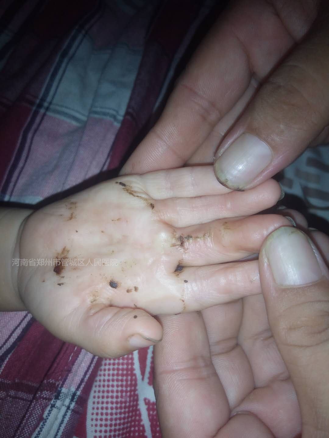 照片是孩子父母发过来的,照得不是很清楚,不过仔细看下也能看出手指头上的疤痕疙瘩完全好了,手掌的疤痕也基本平复了,情况很好.