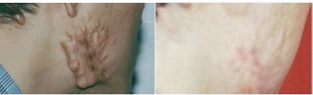 郑某某 27岁 十年前因痤疮(青春痘)在两腮、胸前、背后部留下疙瘩,色红质特硬,疼痒难耐,呈在多个大医院作过手术、激光、冷冻、激素封闭等,治疗后更加恶化,患者呈几度失望,最后抱着试试看的态度来我院就诊,经治疗4个疗程后,疙瘩基本变平,疼痒消失。